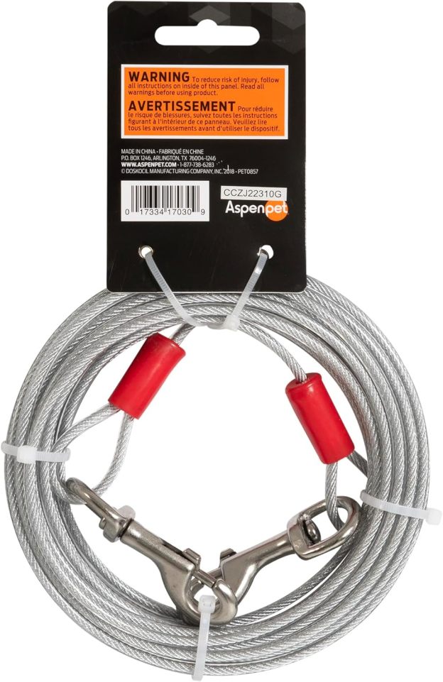 3417030S size: 30 feet, Color: Clear Features: -vinyl tie out.-1700 pound break strength.-Use with cider mill trolley or stake.-Dogs up to 100 pounds.-Strong galvanized aircraft cable, coated with crack resistant vinyl.Options: -available in 10 feet, 15 feet, 20 feet and 30 feet sizes.Dimensions: -Dimensions: 7" H x 2" W x 9" D.