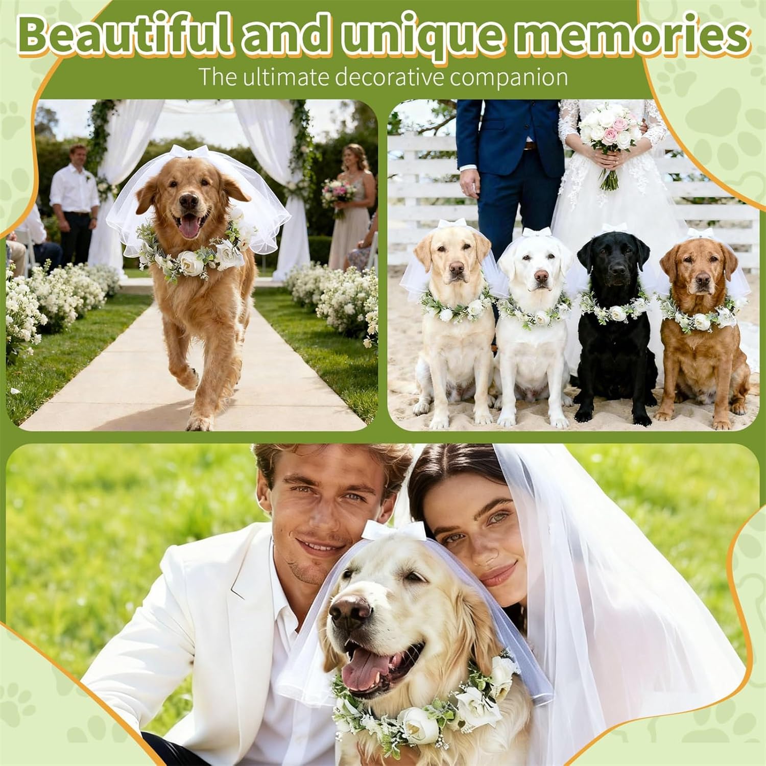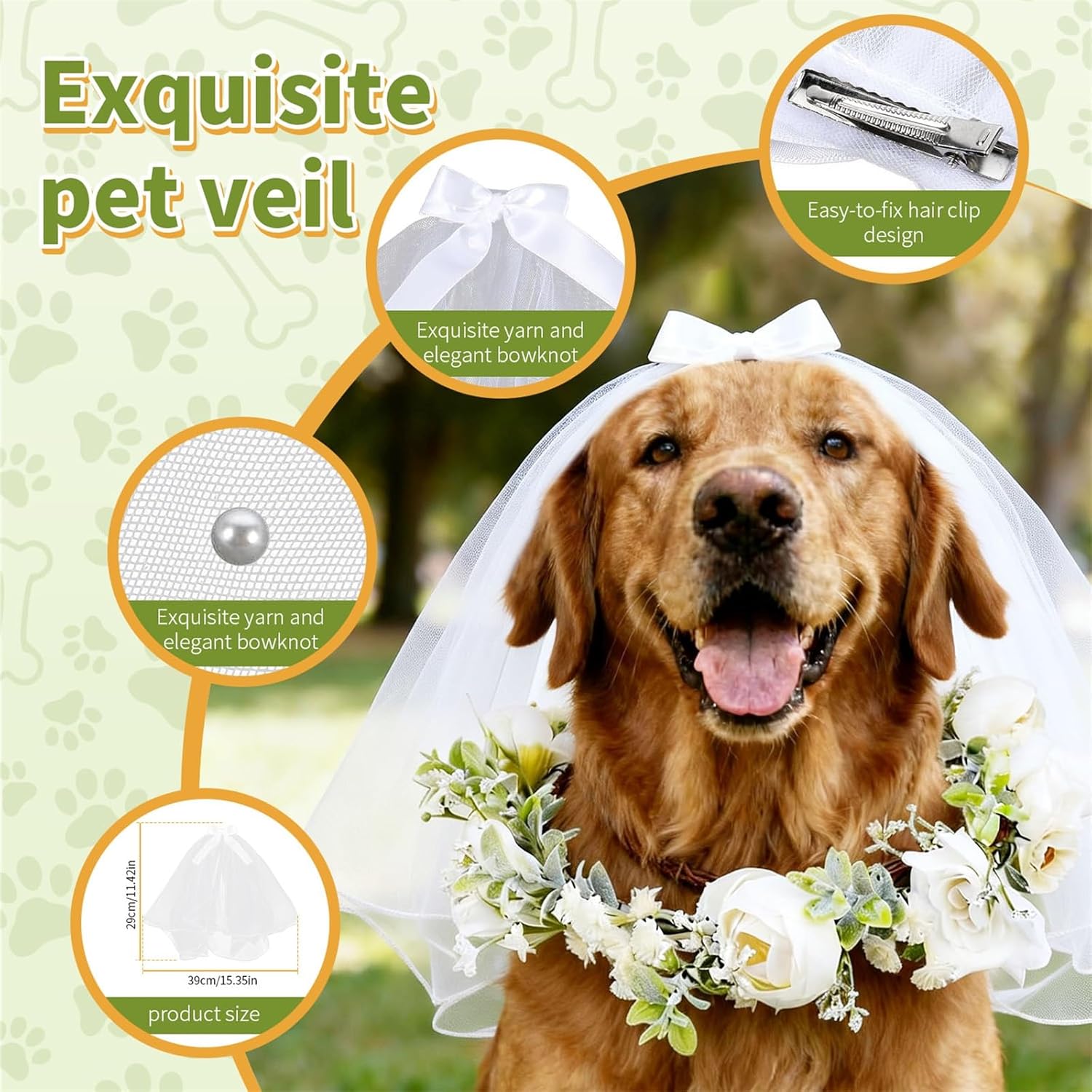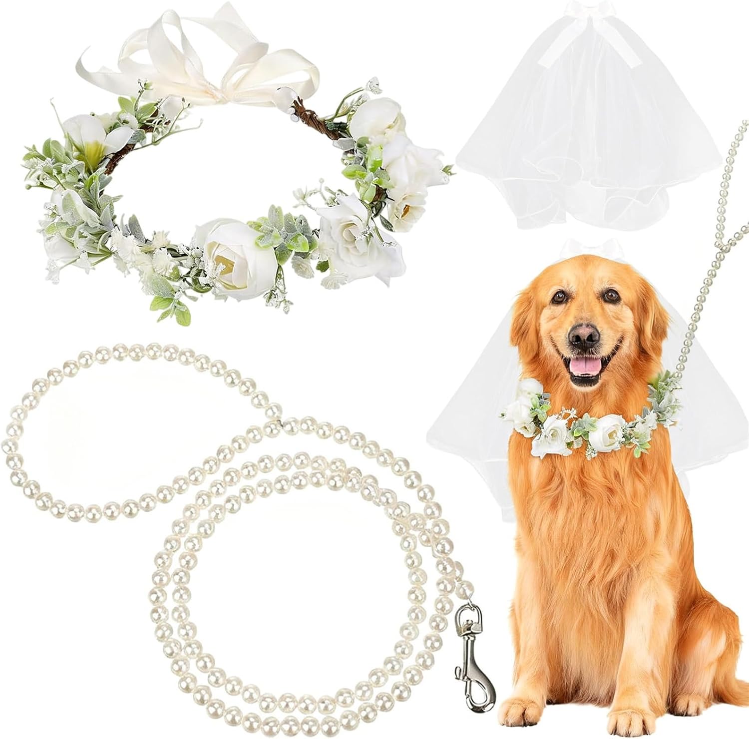 Dog Wedding Flower Collar with Pearls Leash and Veil Set, Handmade Floral dog wedding collar and dog wedding outfit, Adjustable Wreath & Beaded Leash, Perfect Pet Wedding Prop