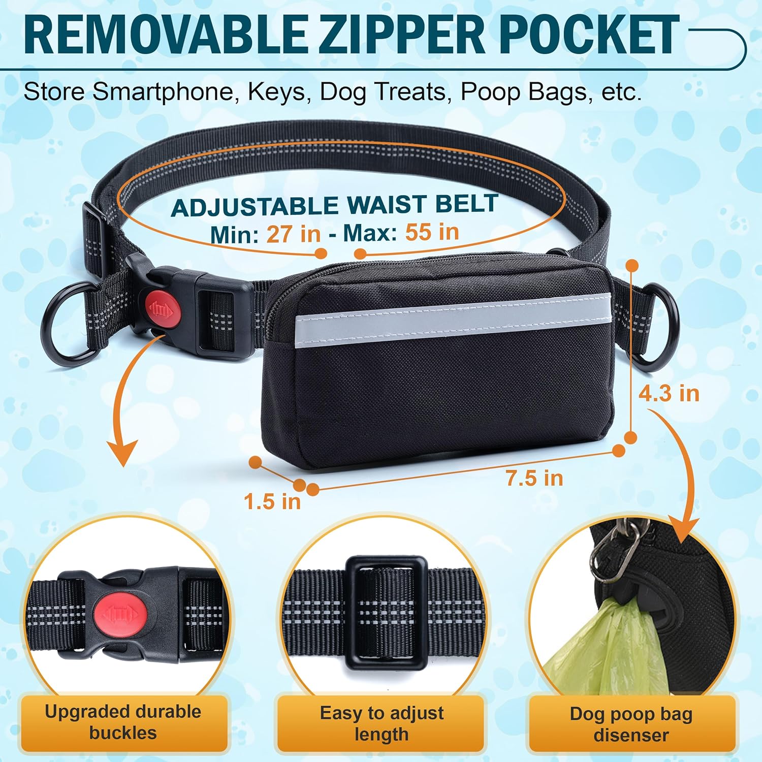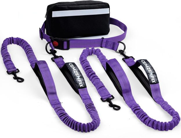 Hands Free Dog Leash for 2 Dogs – Waist Leash for Dog Walking with Dual Bungee, Reflective No Pull Design, Adjustable Belt & Pouch for Running, Hiking, Jogging