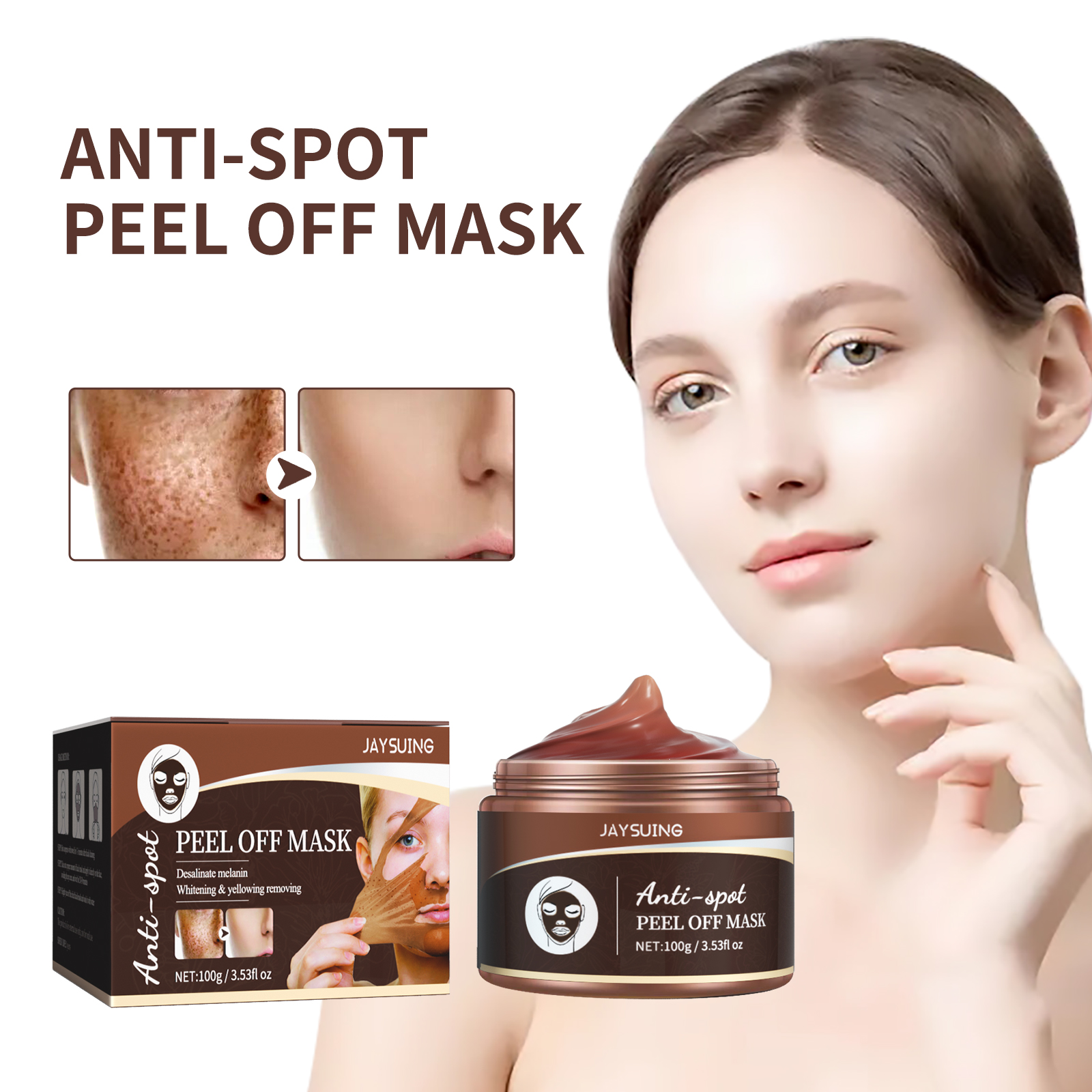 Our peel-off mask contains glycerin and 1.2-hexanediol. It can deeply inhibit and reduce melanin production, preventing the formation of new spots. Layered imperfections penetrate layer by layer into the areas where melanin accumulates, breaking down the pigmentation spots. Forms a moisture-locking barrier on the skin's surface, preventing dark spots from the source. Moisturizes and nourishes, replenishing the skin's required hydration, making the skin smooth and radiant. Its usage is very simple: after cleansing, apply a hot towel to your face for 1-3 minutes, then apply an appropriate amount of the mask directly onto your face, avoiding the eye area. Wait for 20-30 minutes, gently peel off the dry mask, and rinse with water. Whitening and brightening, removes yellow spots and dark spots, evens skin tone, and makes skin soft and delicate.